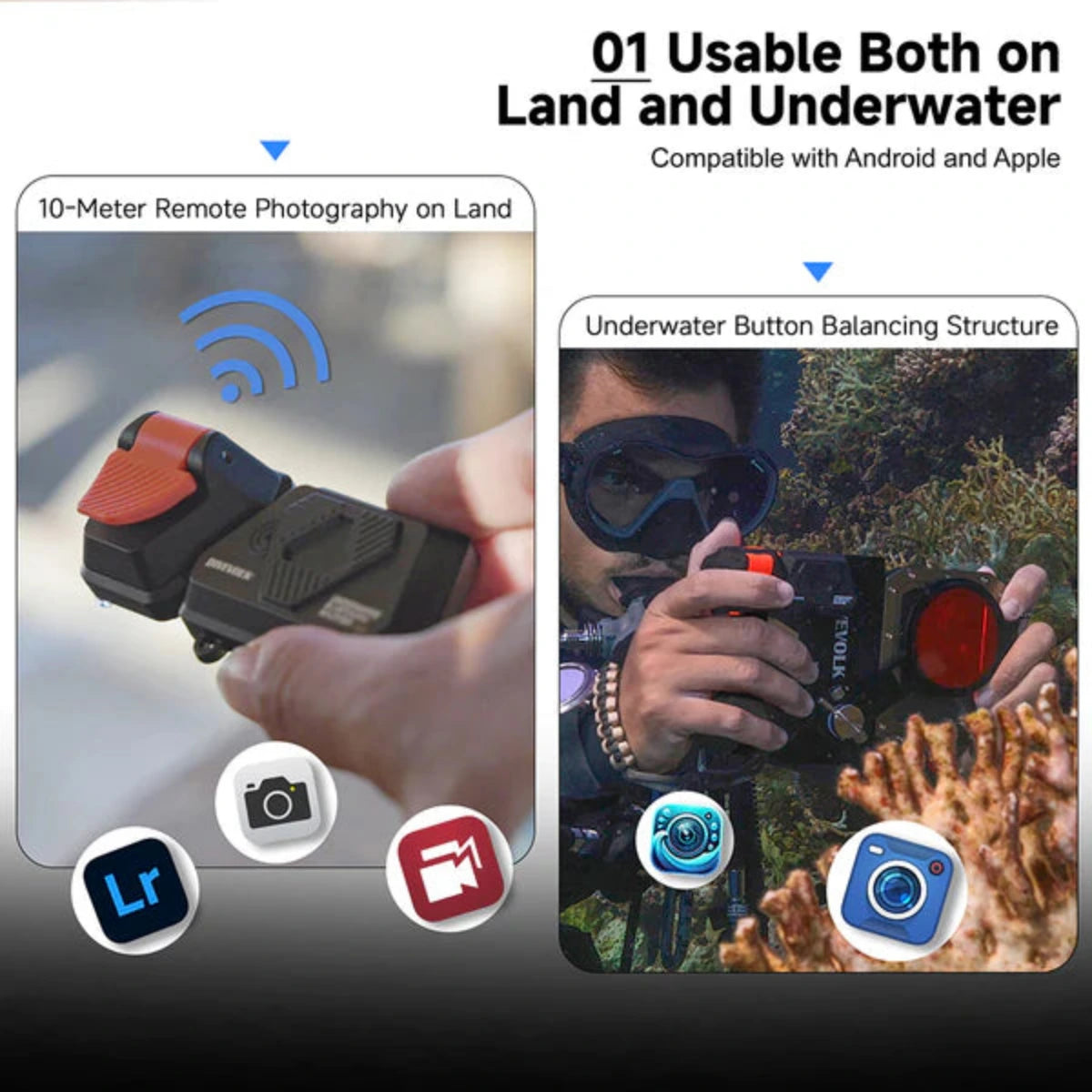 - Sowohl an Land als auch unter Wasser einsetzbar: Entwickelt zur Steuerung des Kameraverschlusses für Fotos, Videos und den Zugriff auf Foto-Apps von Drittanbietern via Bluetooth unter Wasser.