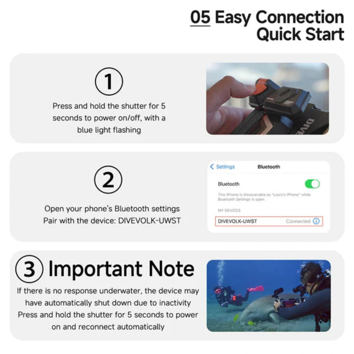 Ob beim Schnorcheln oder Tieftauchen – der DIVEVOLK -Auslöser bietet ergonomische Präzision und Zuverlässigkeit direkt an Ihren Fingerspitzen. Ideal für Android- und iPhone- Nutzer.