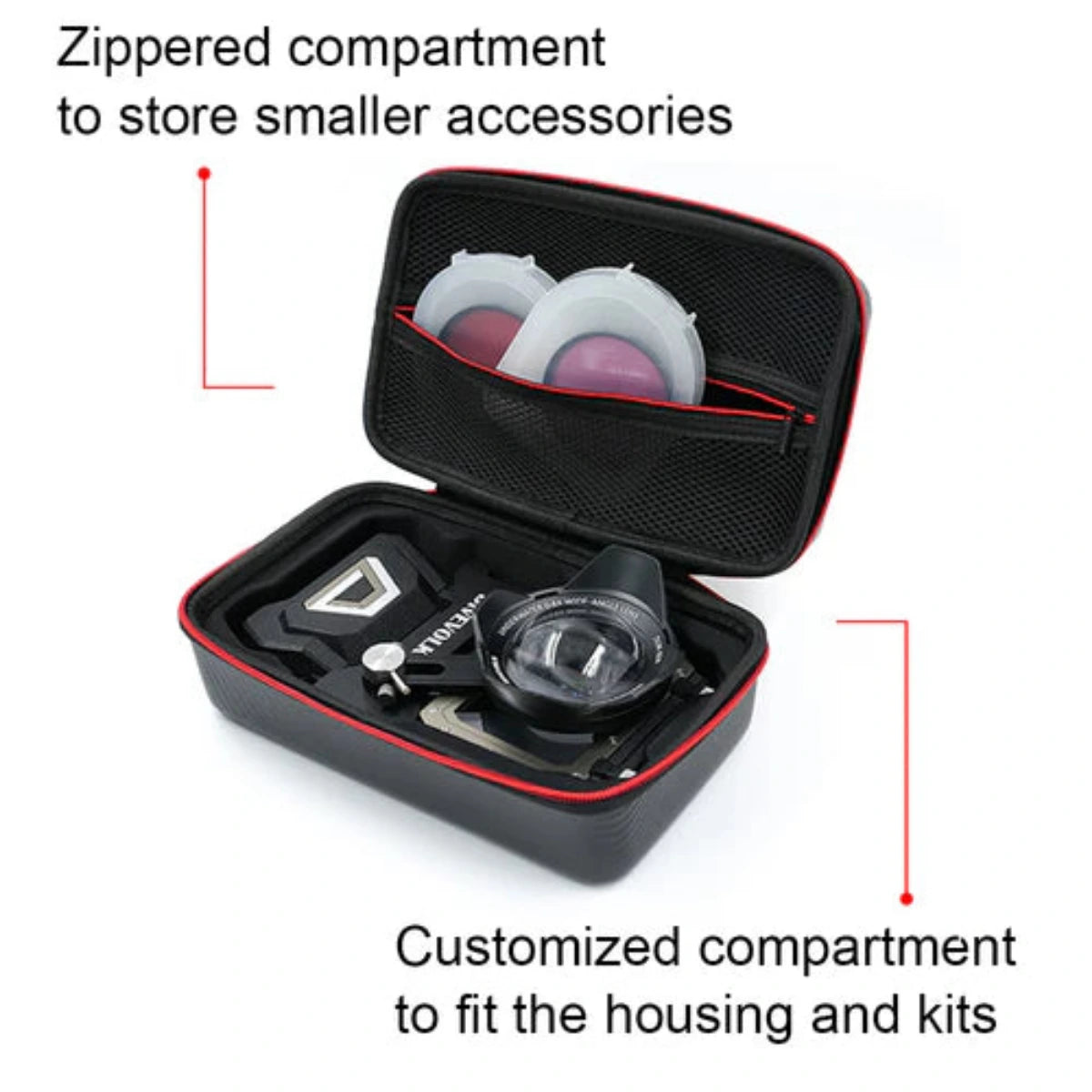 Der ideale Reisebegleiter für Unterwasserfotografie-Begeisterte: ein stilvoller und sicherer Organizer für Ihr Unterwassergehäuse und Zubehör. Ob Sie nur ein einzelnes SeaTouch 4-Gehäuse oder ein komplettes Set mit Clips, Objektiven und weiterem Zubehör einpacken – im unteren Fach findet alles problemlos Platz. Das obere Reißverschlussfach eignet sich perfekt für kleinere Accessoires, schützt Ihre Ausrüstung und optimiert den Platz in Ihrem Gepäck. Erleben Sie unvergessliche Unterwasserabenteuer mit dieser Reisetasche – ein unverzichtbares Werkzeug für jeden Tauchgang.