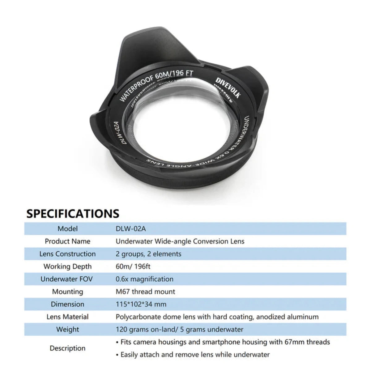 Dieses vielseitige „Nassobjektiv“ lässt sich selbst unter Wasser problemlos anbringen und abnehmen und ermöglicht so einen schnellen und unkomplizierten Wechsel zwischen verschiedenen Objektiven. Dank des universellen 67-mm-Gewindes ist das Weitwinkelobjektiv zudem mit einer Vielzahl kompakter Kameragehäuse kompatibel und somit eine hervorragende Option für alle, die ihre fotografischen Möglichkeiten erweitern möchten.