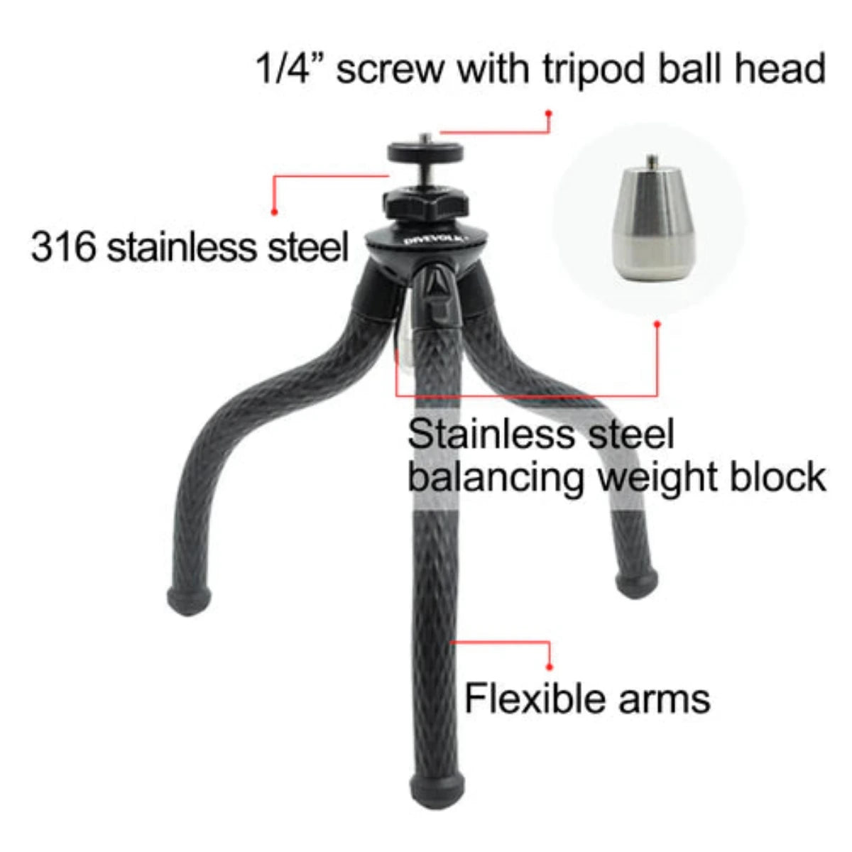 Entdecken Sie die Revolution in der Unterwasserfotografie: Das kompakte, flexible Unterwasserstativ , speziell für Abenteuer unter Wasser entwickelt. Gefertigt aus robustem Edelstahl 316 , ersetzt dieses langlebige Stativ herkömmliche Eisenteile und bietet Korrosionsbeständigkeit und hohe Lebensdauer. Ausgestattet mit einem Edelstahl-Ausgleichsblock , gewährleistet es Stabilität selbst unter schwierigsten Unterwasserbedingungen.