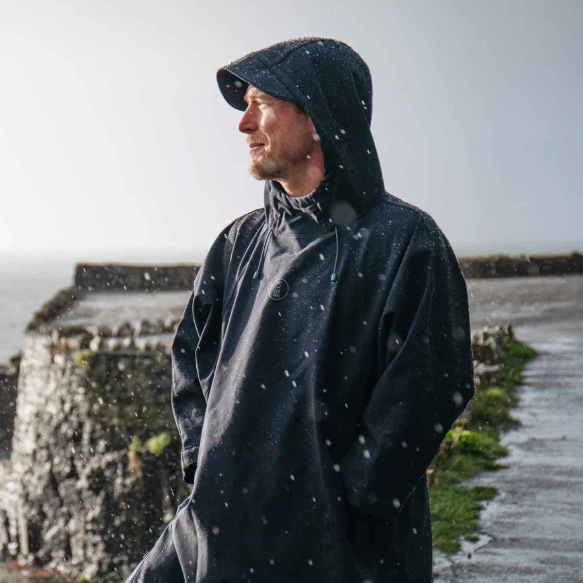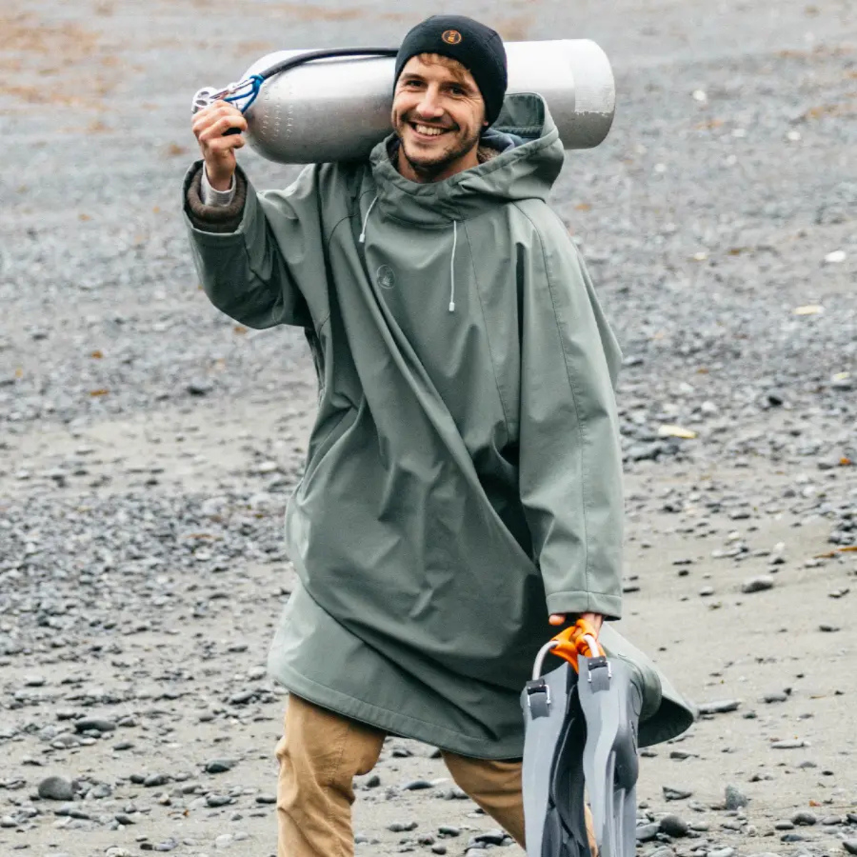 Beat the weather. This all-weather poncho is warm, quick-drying and packs down compactly, making it easy to take anywhere. Throw it on to change into your wetsuit on the beach or boat, to warm up after a session in the water or to cover up between dives. The waterproof, fleece-lined material is lightweight, comfortable and treated with an eco-friendly, fluorine-free waterproof finish.