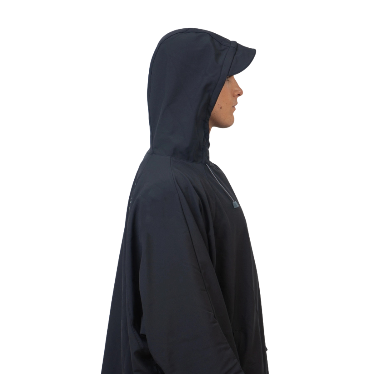 With snap-fastened side openings, changing is easy, and the generous hand pockets add comfort when warming up. The adjustable hood with peak offers excellent protection even in difficult weather conditions, making this poncho an indispensable piece.